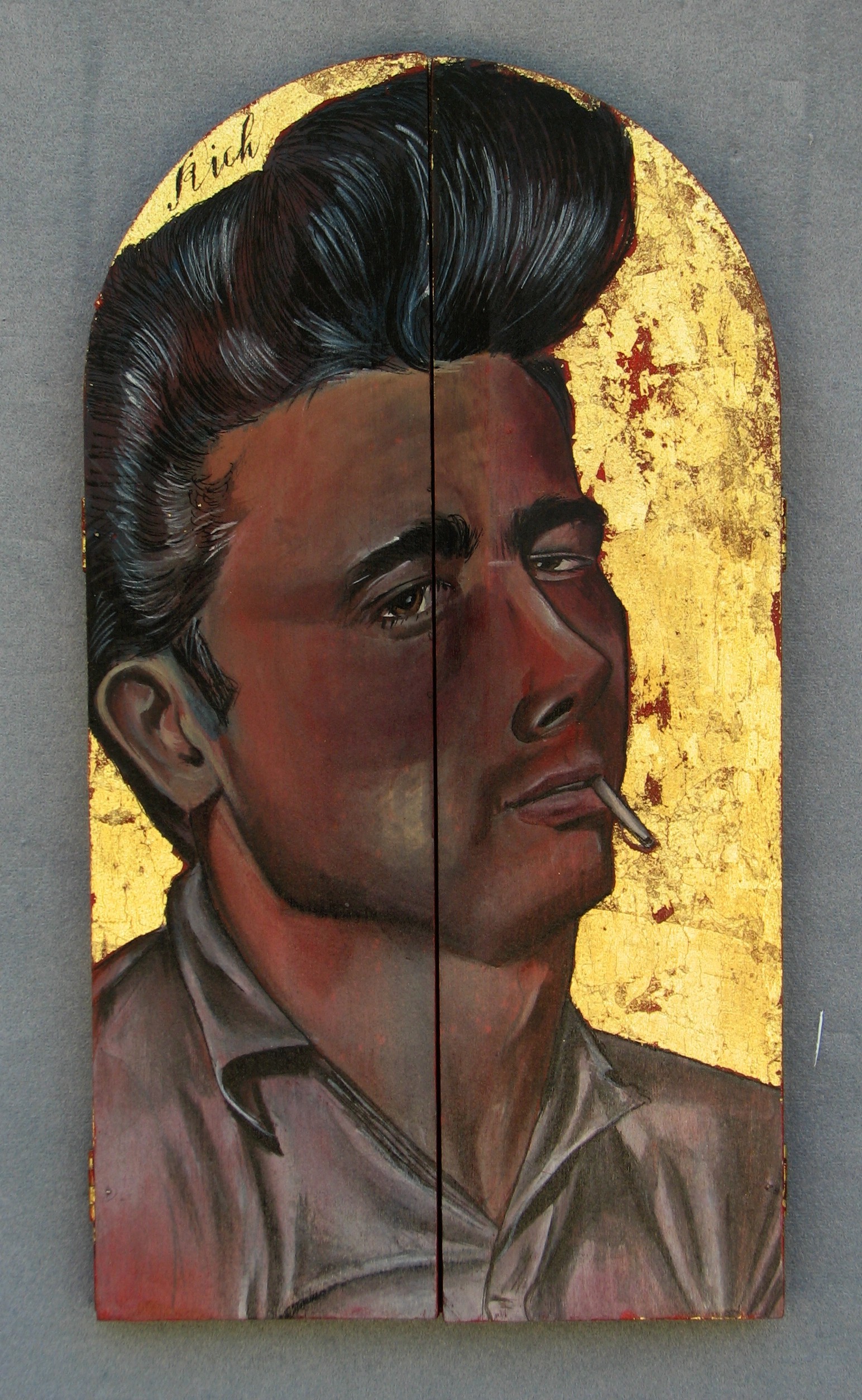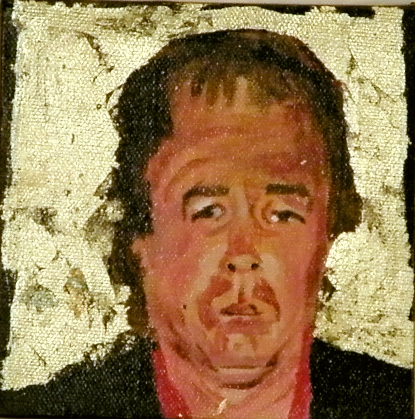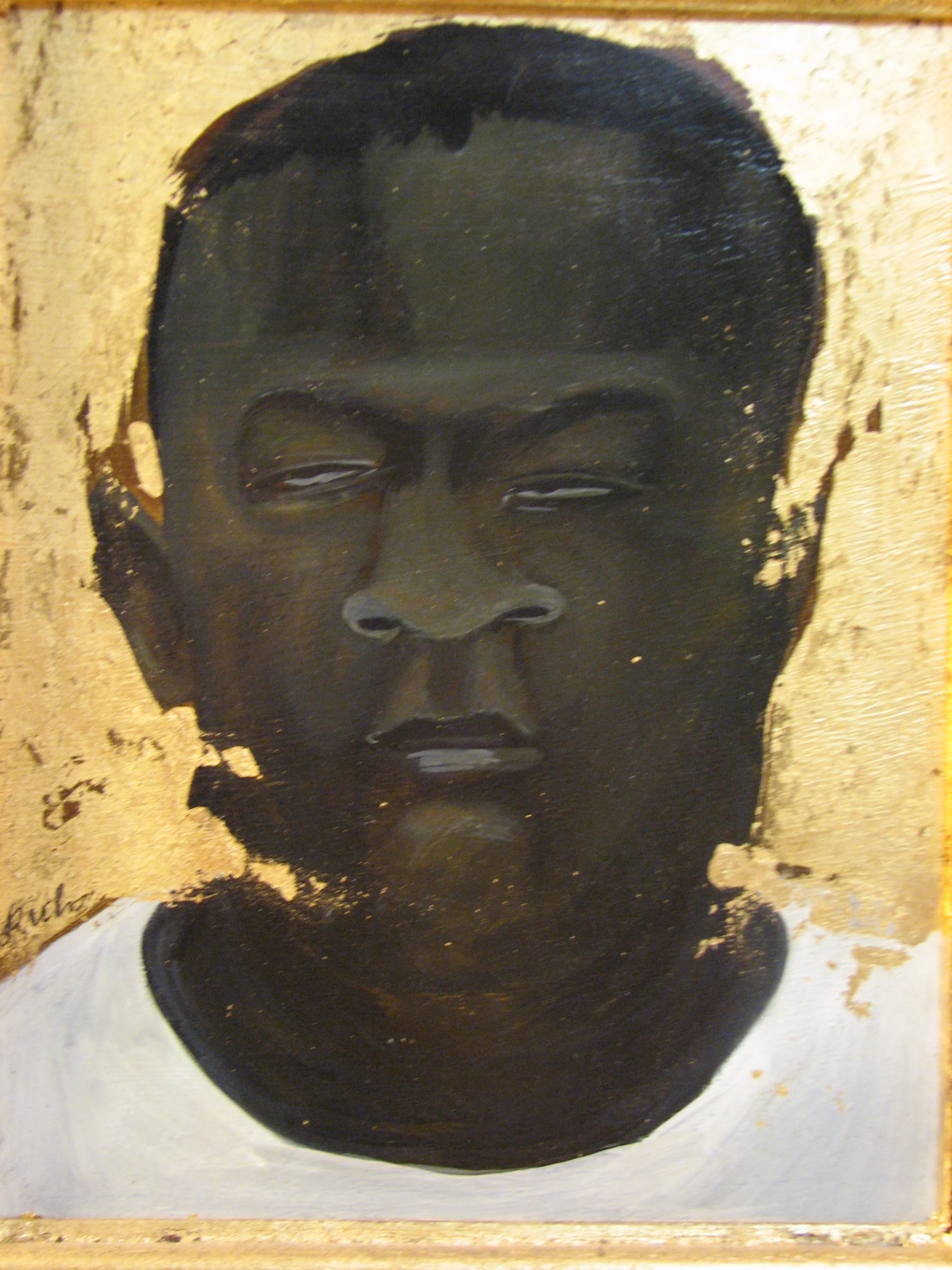 Commissioned portrait prices: 12 X 12 inches $550, 14 X 14 inches $750 16 X 16 inches $980, 18 X 18 inches $1,240, 20 X 20 inches $1.525, 30 X 30 inches,$3440, $1,525, 30 X 40 inches $4,585. All works are done in acrylic, and gold leaf, except for the ones done on paper which are done in gouache, or the Iconvicts done in gouache on tin and gold leafed. For bulk orders ask for Mr. Whiskers.