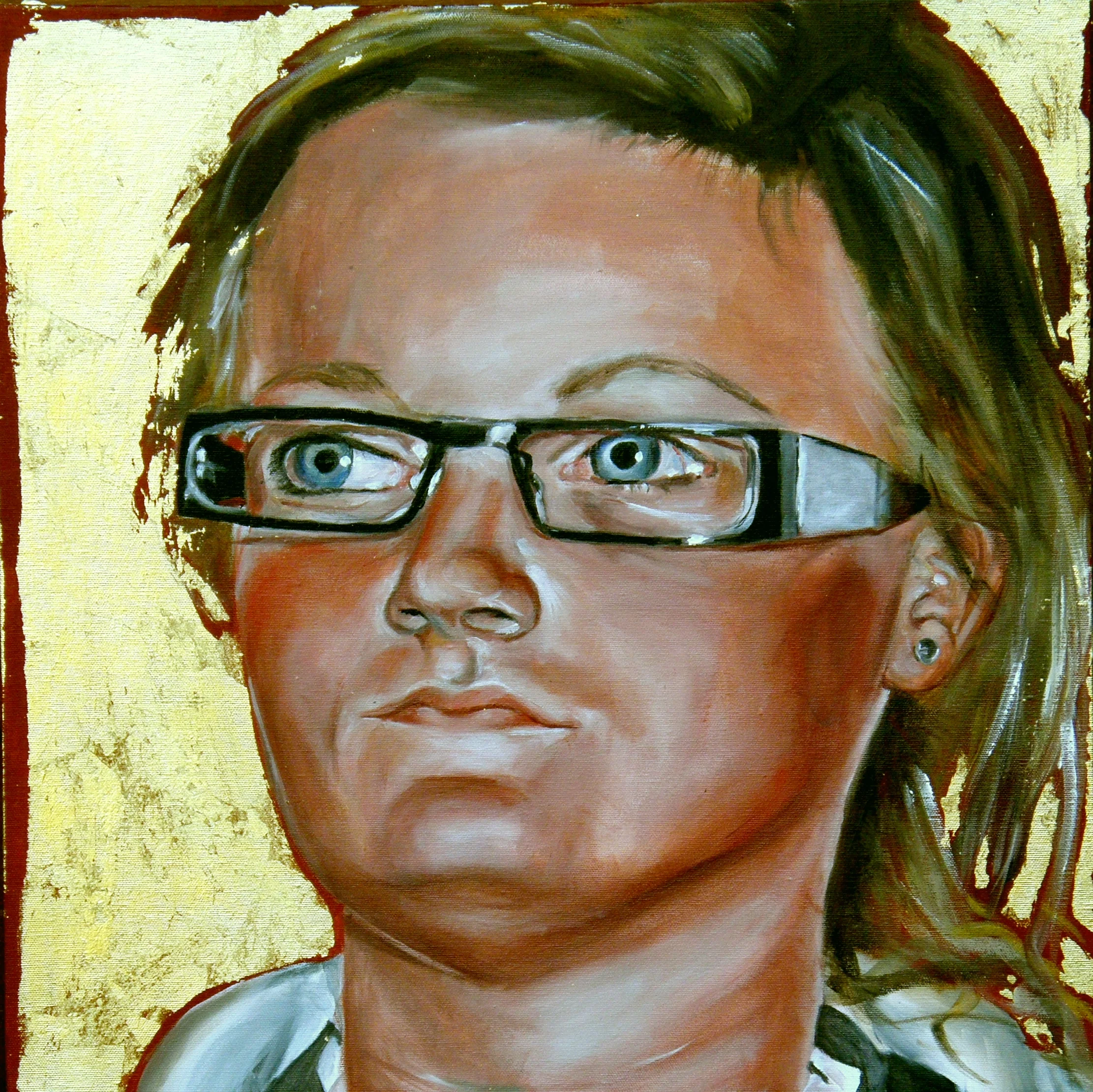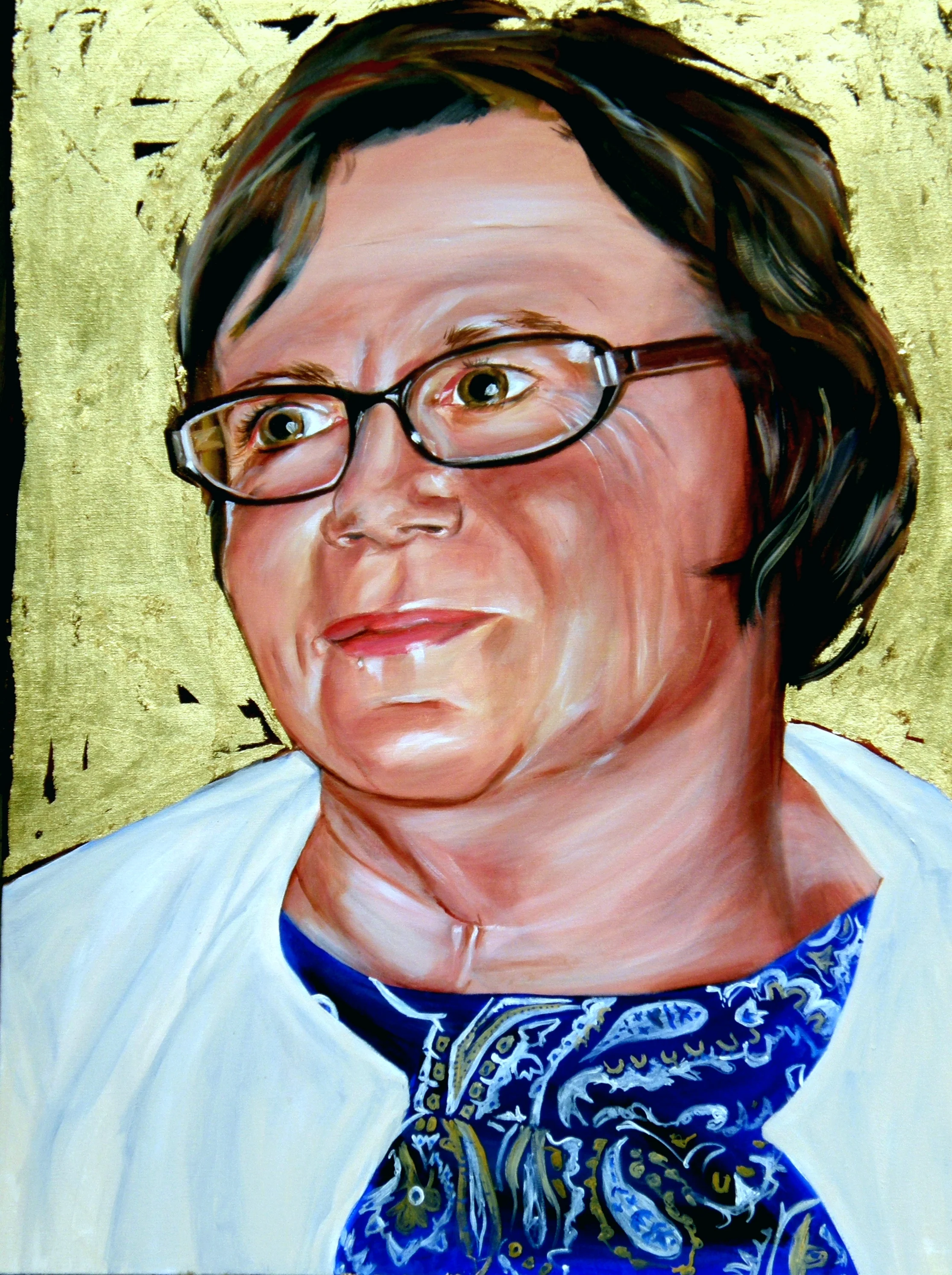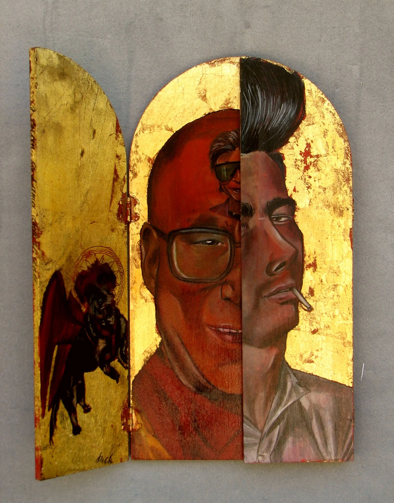 Work includes acrylic paintings on canvas with gold leaf ranging in size from 5X5 inches to 4X3 feet. Crosses are acrylic, gold leaf on wood. Light switch plates are acrylic, gold leaf on metal. The iconvicts, dark figures are acrylic, gold leaf painted on tin with wooden gold leafframes. There are pen and ink drawings on paper and gouache paintings on paper and pottery with gold leaf. I dream in gold leaf. Egg heads are gouache and gold leaf on either wood or pottery. The Thug Jugs are collaborative pieces of pottery with husband John Hodge: he threw the pieces I made the faces and he fired them. The rest are drawings done directly on my telephone, Samsung Galaxy Note 3 and Samsung has not given me anything for the free advertising.