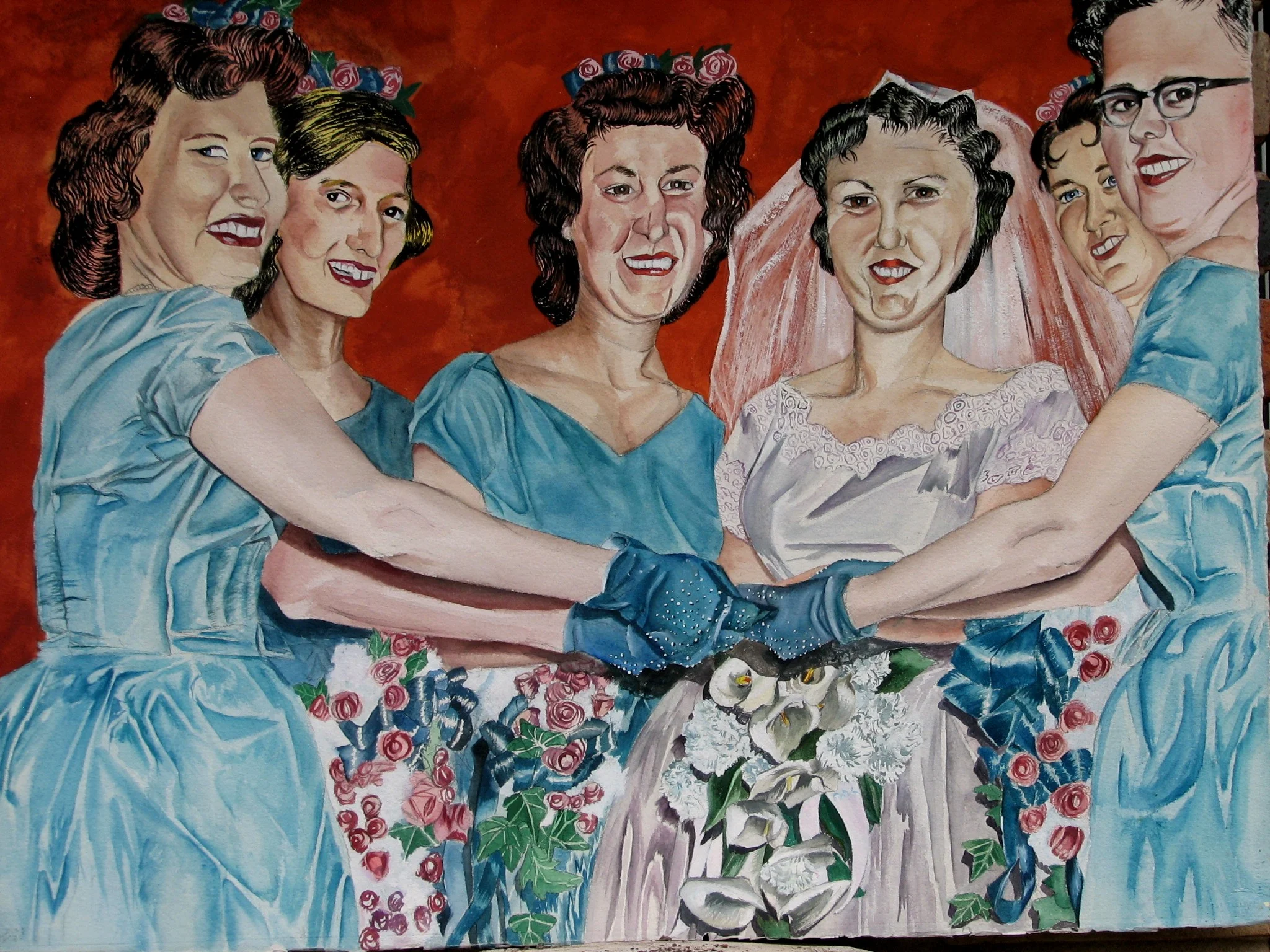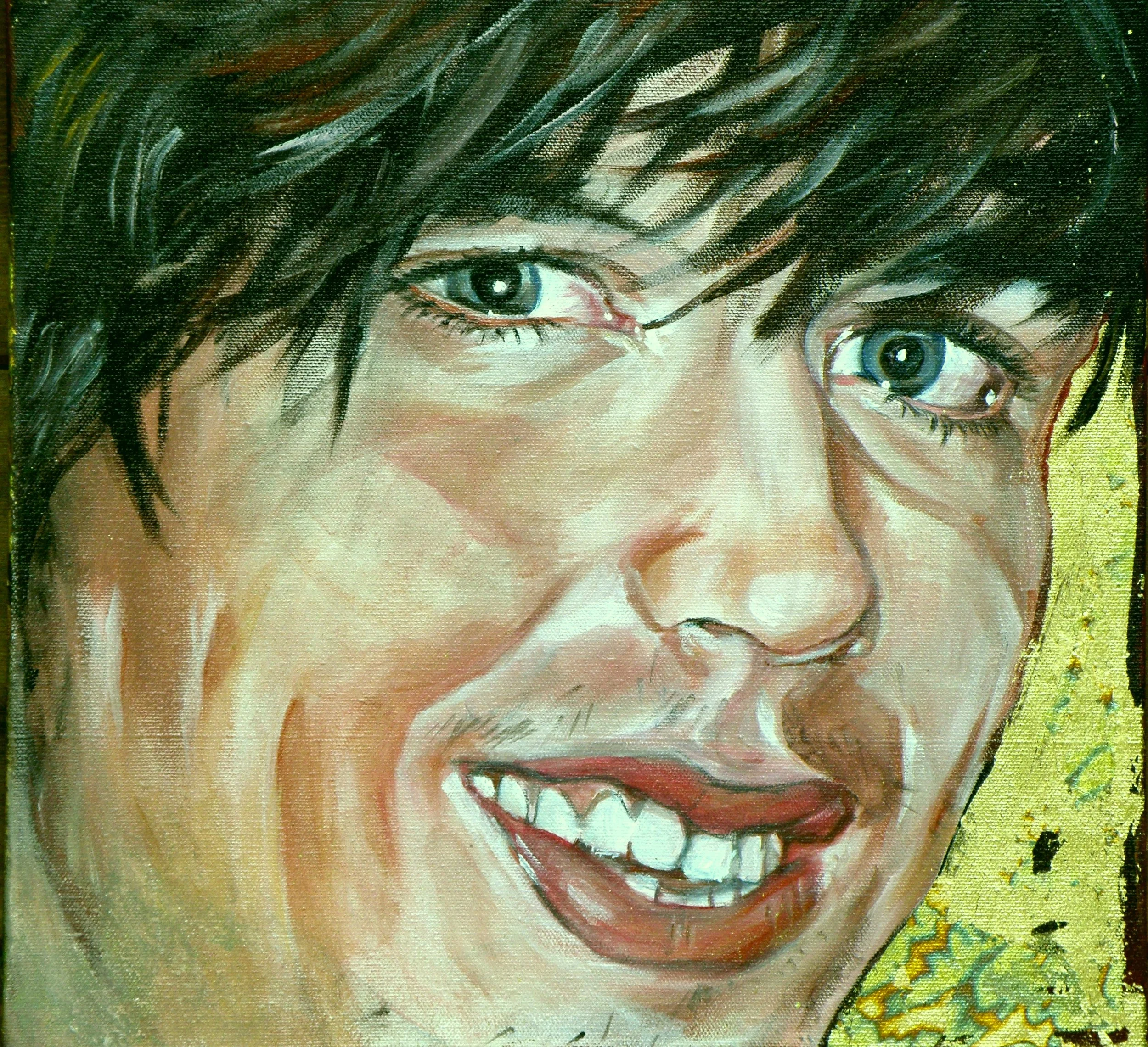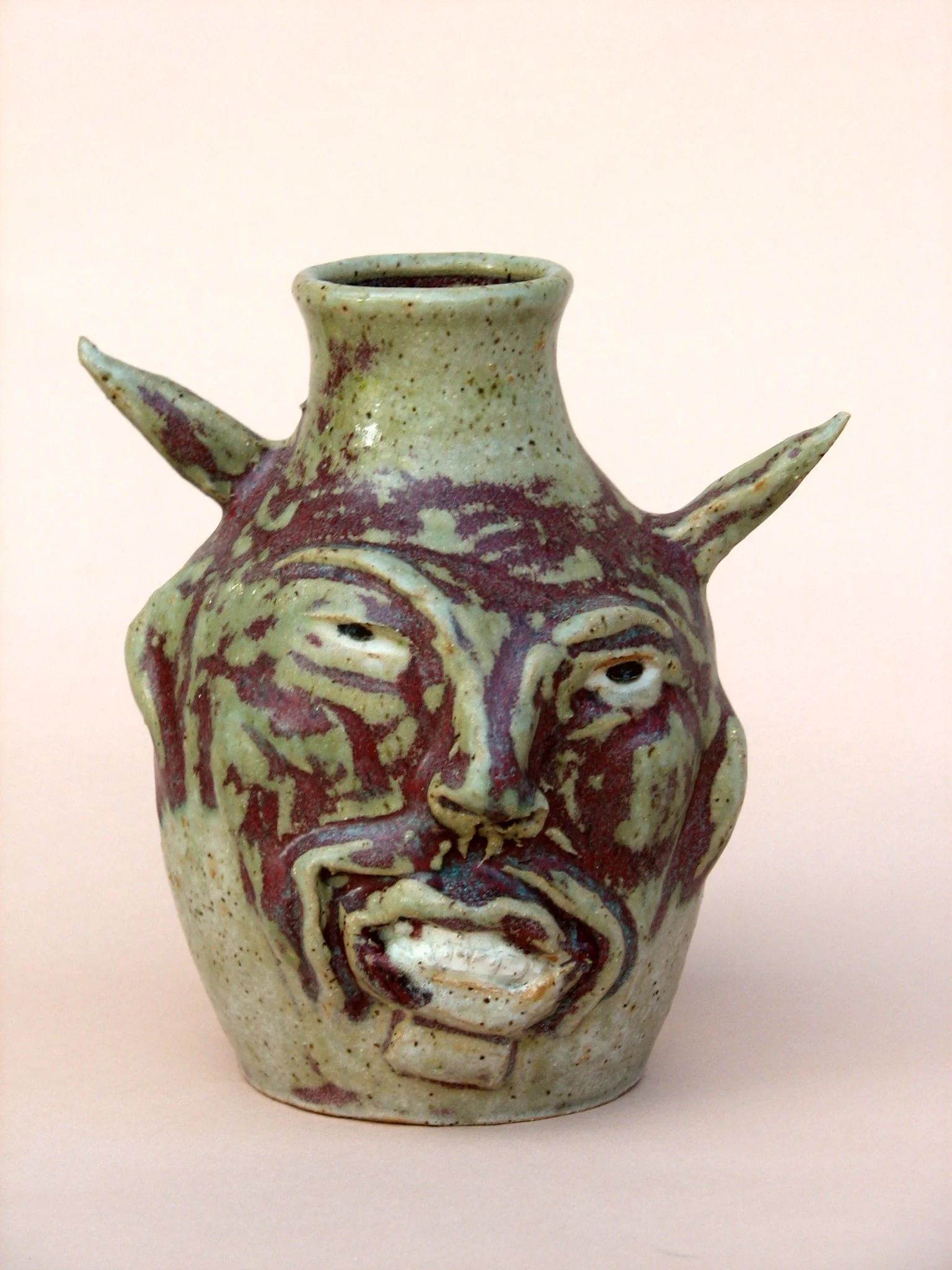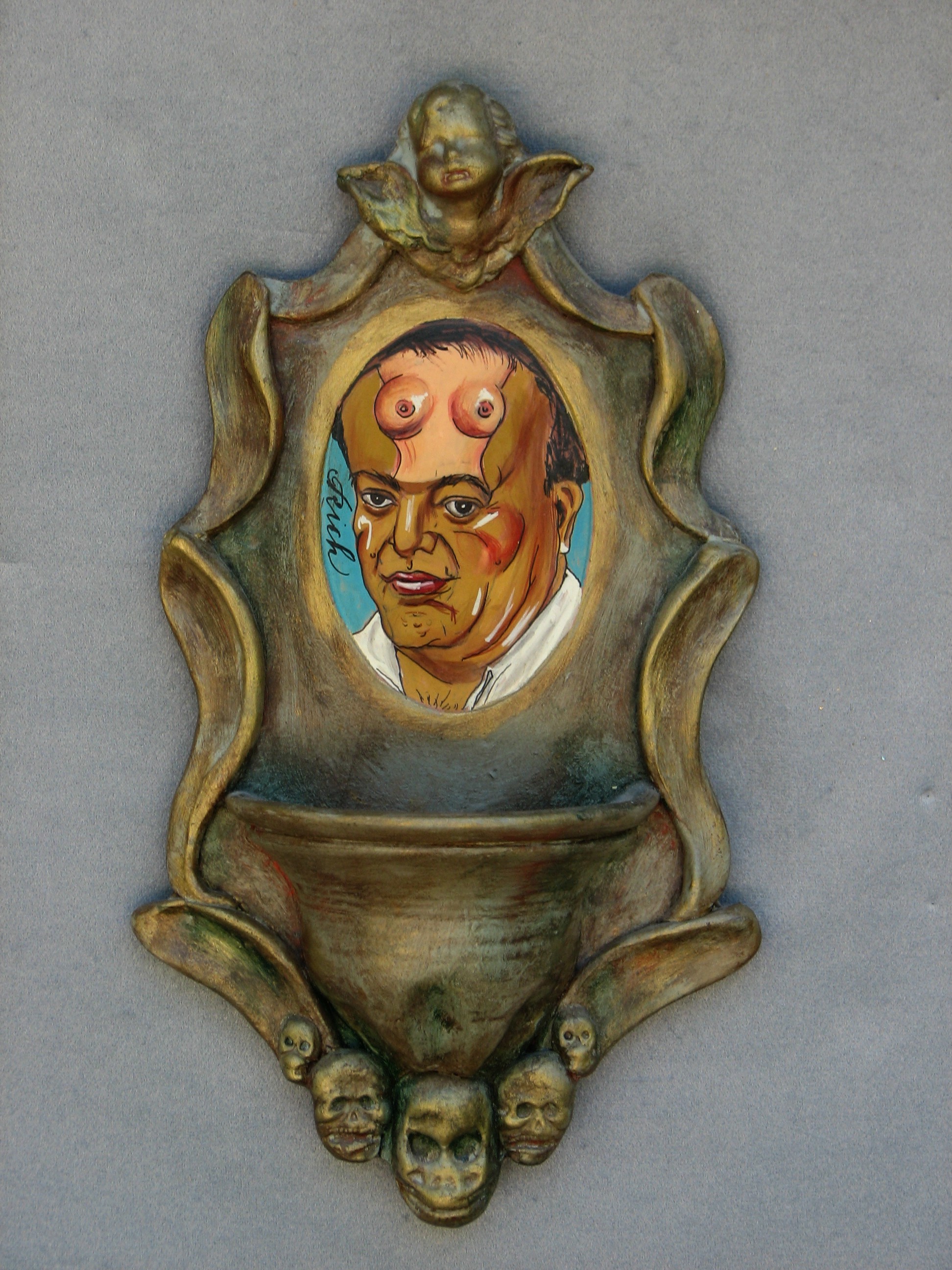 Work includes acrylic paintings on canvas with gold leaf ranging in size from 5X5 inches to 4X3 feet. Crosses are acrylic, gold leaf on wood. Light switch plates are acrylic, gold leaf on metal. The iconvicts, dark figures are acrylic, gold leaf painted on tin with wooden gold leafframes. There are pen and ink drawings on paper and gouache paintings on paper and pottery with gold leaf. I dream in gold leaf. Egg heads are gouache and gold leaf on either wood or pottery. The Thug Jugs are collaborative pieces of pottery with husband John Hodge: he threw the pieces I made the faces and he fired them. The rest are drawings done directly on my telephone, Samsung Galaxy Note 3 and Samsung has not given me anything for the free advertising.